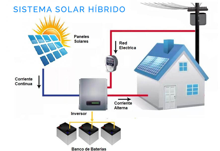 El sistema híbrido de autoconsumo combina lo mejor de ambos mundos: la energía solar con bancos de baterías y conexión a la red eléctrica pública.